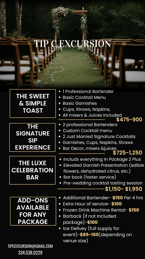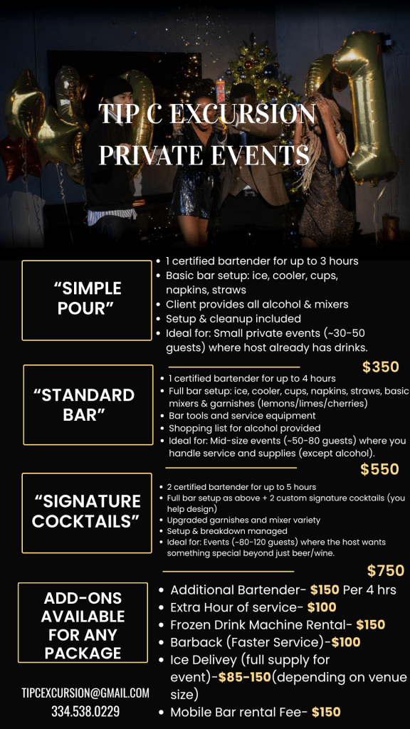 - Specialty Cocktails/Custom Drinks: $50 – $100 per event